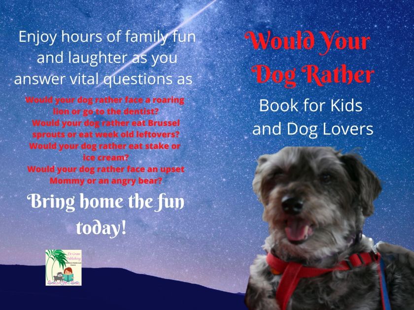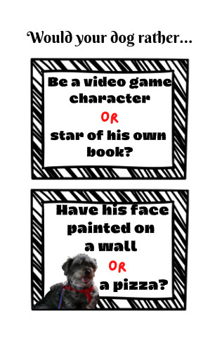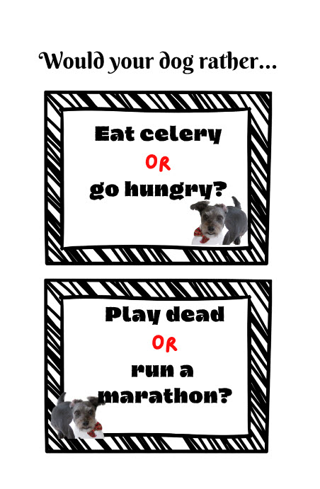 Making a would you rather activity book sounded like fun. But I was not certain what type of questions to ask. That was until I had the idea making a would you rather from my dog’s perspective. So instead of asking would you rather, I made a books asking such important questions as would your dog rather eat celery or go hungry, have his teeth brushed or get a shot, eat raw fish or broccoli?